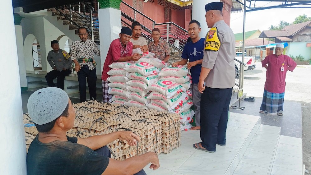 Bagi warga Teluk Berohol, Desa Besilam, Kecamatan Padang Tualang, PT MTJ membagikan ratusan paket sembako, dan di Kampung Persulukan Tuan Guru Besilam, diberikan sebanyak 75 paket sembako.