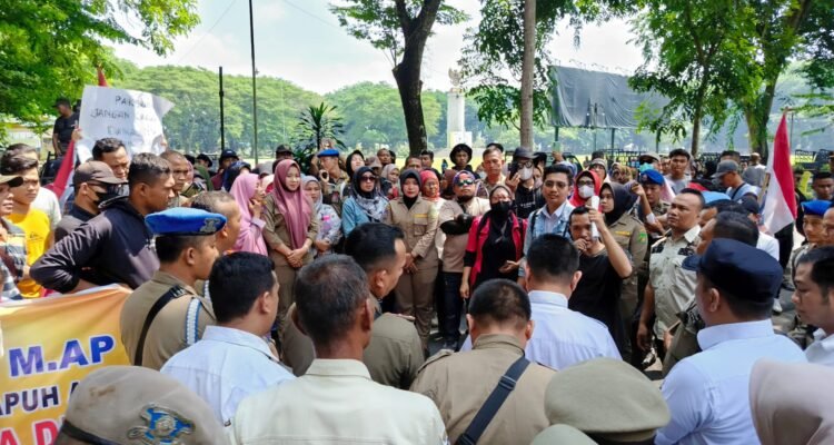 Stabat – Ratusan massa menggelar aksi protes di Kantor Bupati Langkat, Rabu